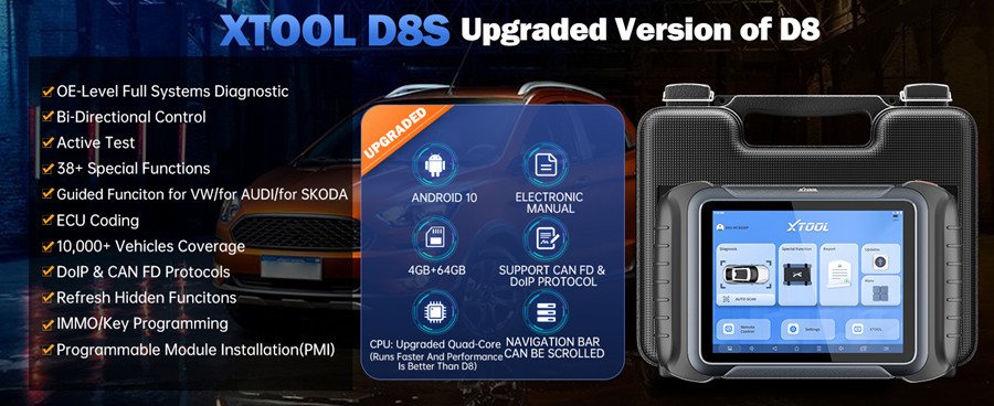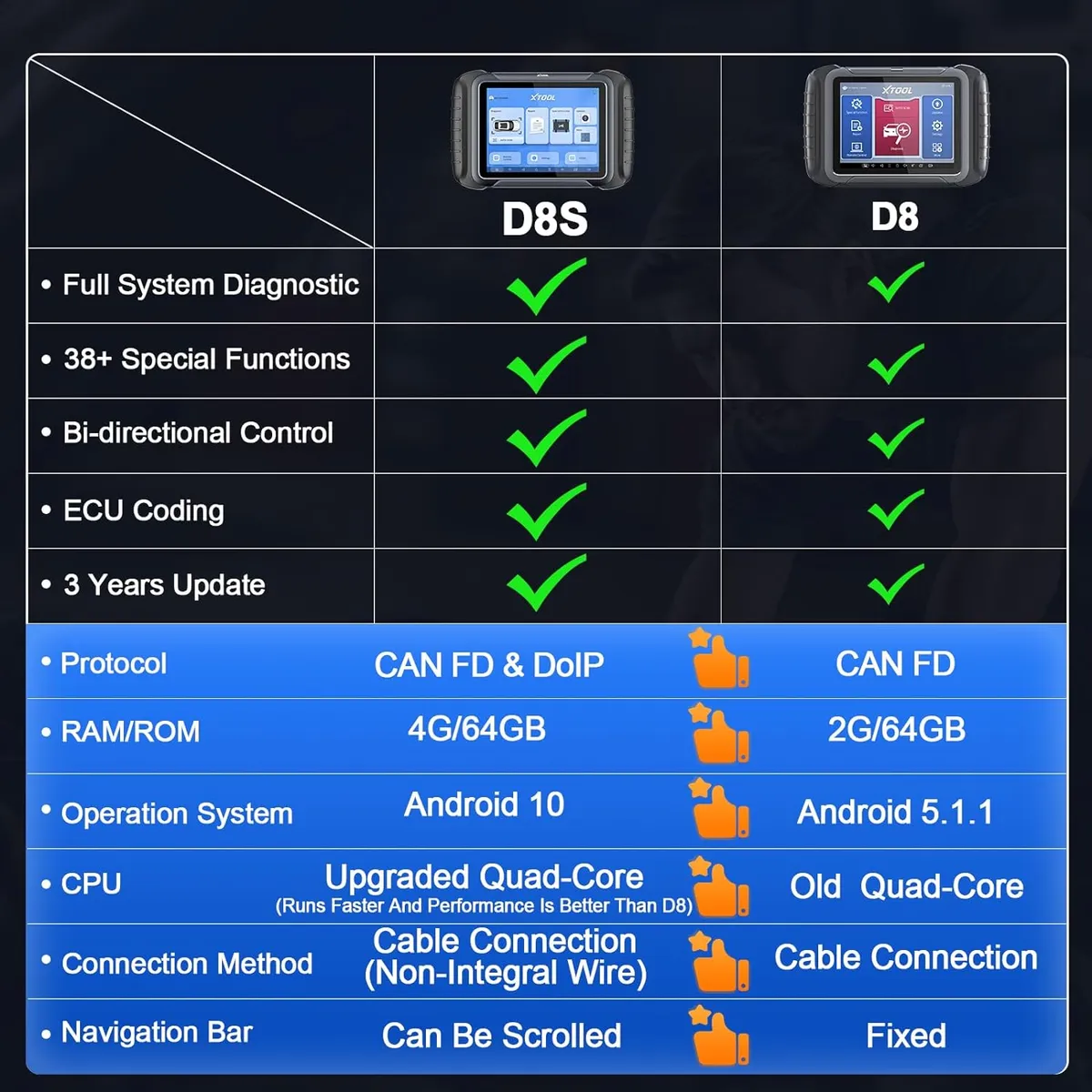 2025 Newest automotive diagnostic tool XTOOL D8S is a upgrade version of XTOOL D8. Upgraded version XTOOL D8S support DOIP protocol, movable navigation bar and electronic user manual which are different to D8.