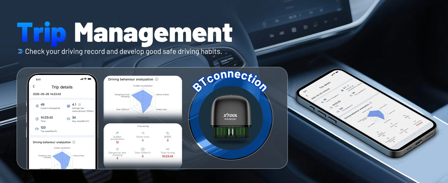 Trip analysis gives you access to data like Top speed, Ave.speed,Ave fuel consumpation etc, help you monitor your car performance and optimize your driving behavior. And will record a series of data analysis such as sudden acceleration, sudden turning, emergency braking, And fatigue driving. With this data, you can clearly know the driving habits of yourself or your family, so that you can have better driving habits and let life is safer.