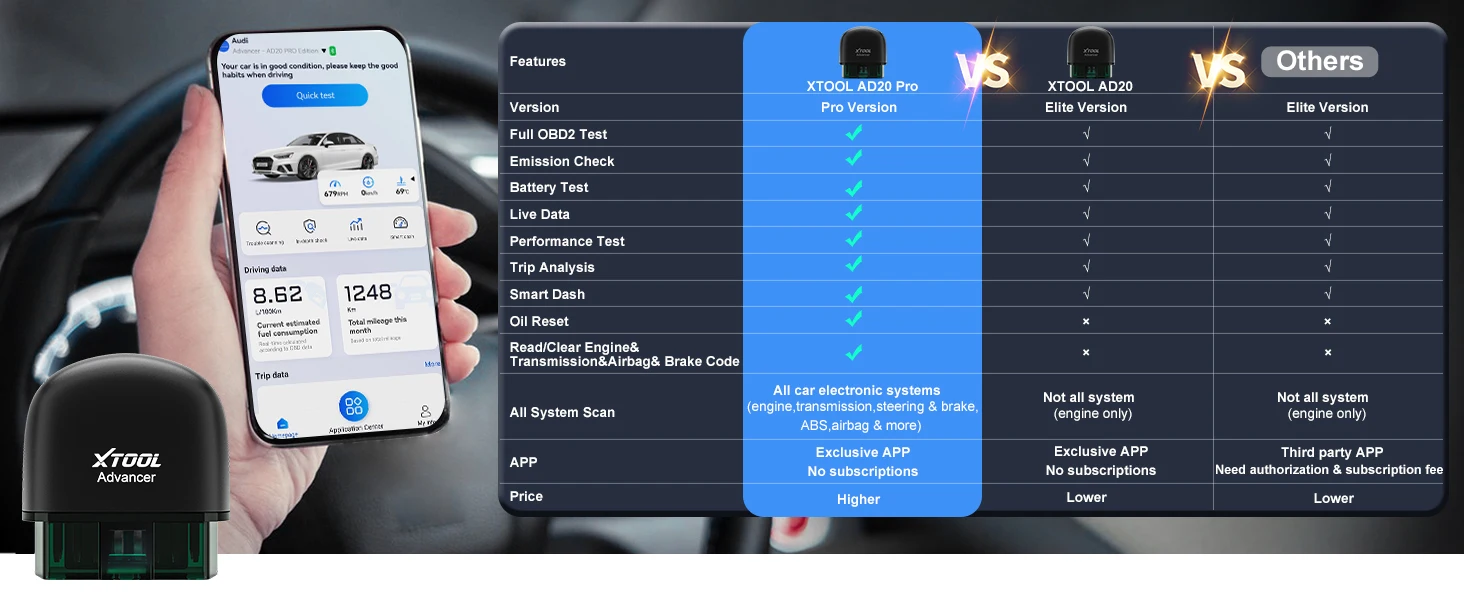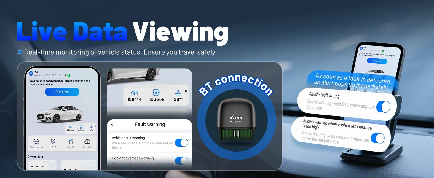 Compared to other cheap code readers, our Bluetooth XTOOL Advancer AD20PRO code readers & scan tools can display real-time vehicle sensor data in both text and graphical formats, allowing you to visualize them more intuitively, such as calculating load values, engine coolant temperature, engine speed, vehicle speed, air flow sensors and more. In addition, you can view freeze frame data and compare it with real-time data and fault codes to better understand what is happening with your vehicle