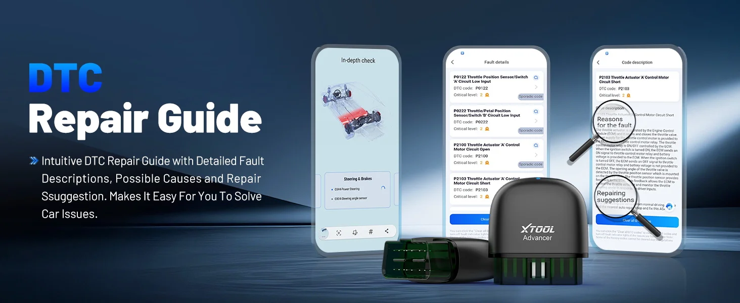 Bluetooth XTOOL AD20PRO code reader can lookup the OBD2 fault code’s definition directly, including the fault description, the cause of the fault, maintenance suggestions and background knowledge, saves your searching time and help you better understand the fault code definition.
