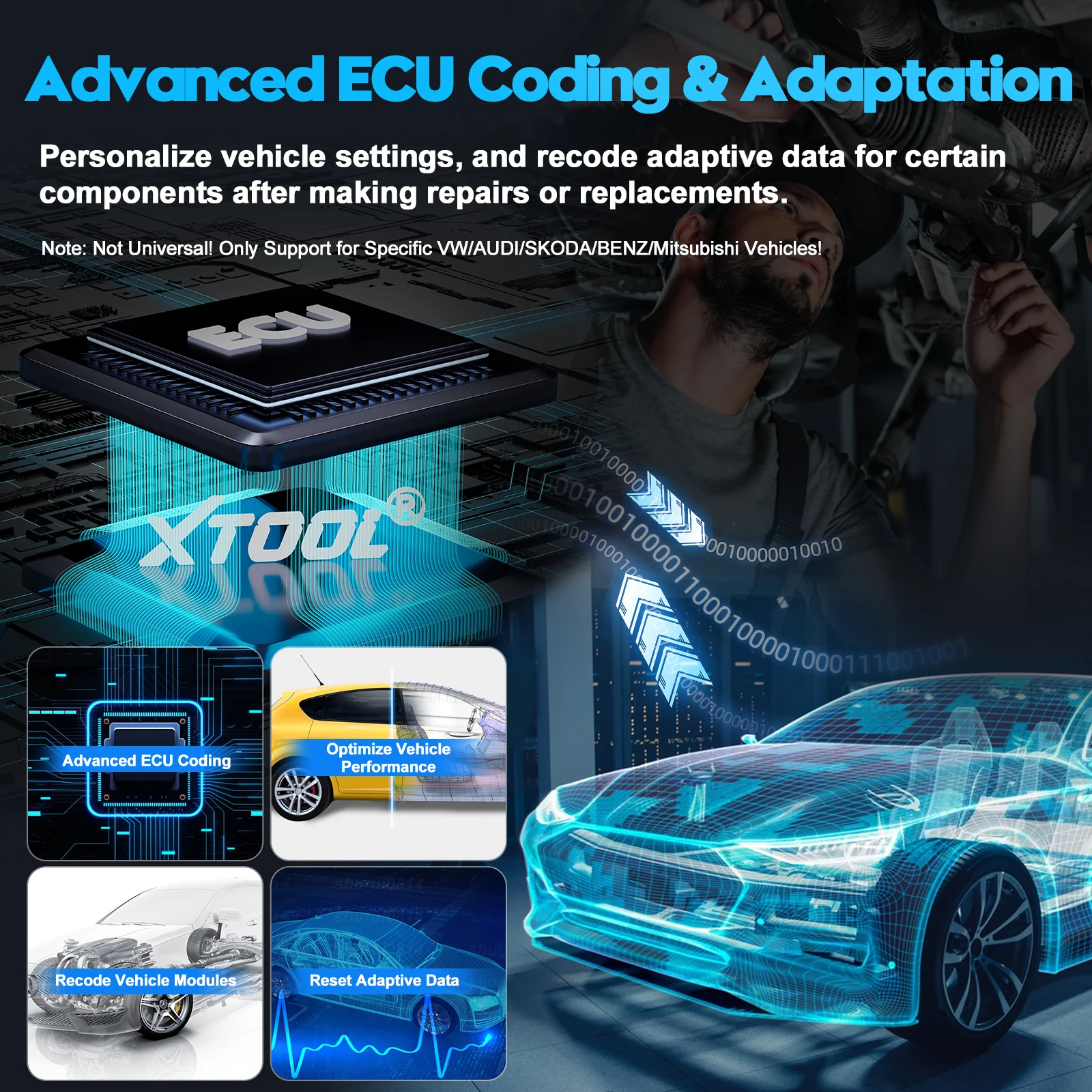 The XTOOL D7W automotive diagnostic tool has advanced ECU coding functions, allowing users to code according to their specific needs or preferences, and the process allows for customization and optimization of these functions. Adaptive data for certain components can be reprogrammed after replacement to enhance vehicle performance, and hidden features can be refreshed to customize car settings and disable annoying features. For example: engine management, transmission control.