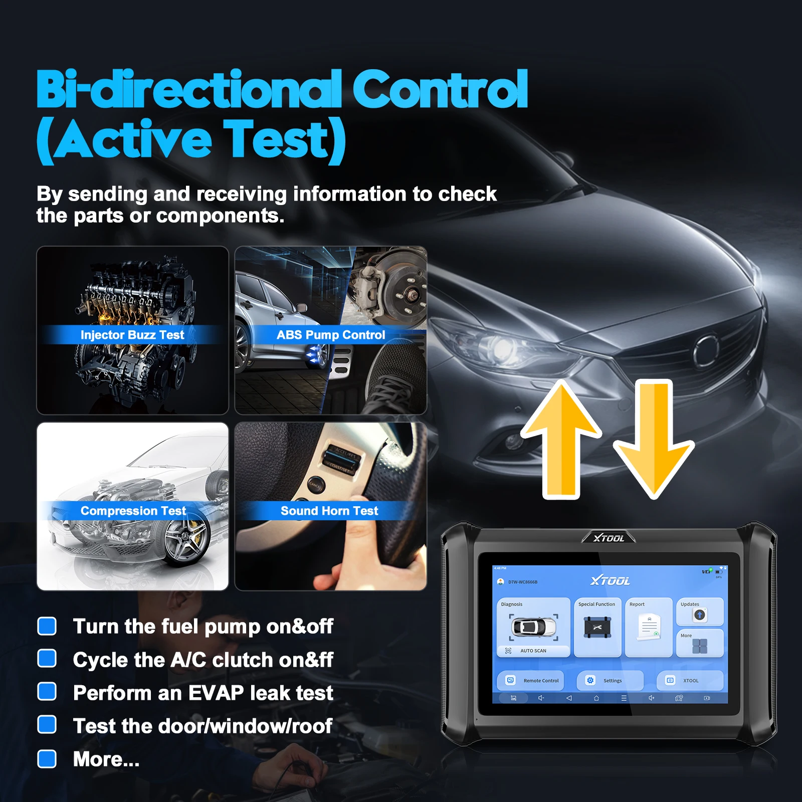 XTOOL D7W is a idirectional control scan tool that allows users to request information or command modules to perform specific tests and functions while observing the resulting data for troubleshooting and quick repairs. Users can use diagnostic tools to perform multiple active tests on different systems, allowing users to interact directly with various components. By conducting these tests it is possible to confirm if the part is working properly or if it needs to be replaced or further investigated. The bi-directional control feature saves the user (individual/machinist/shop) a lot of time and helps them get more done every day. For example: